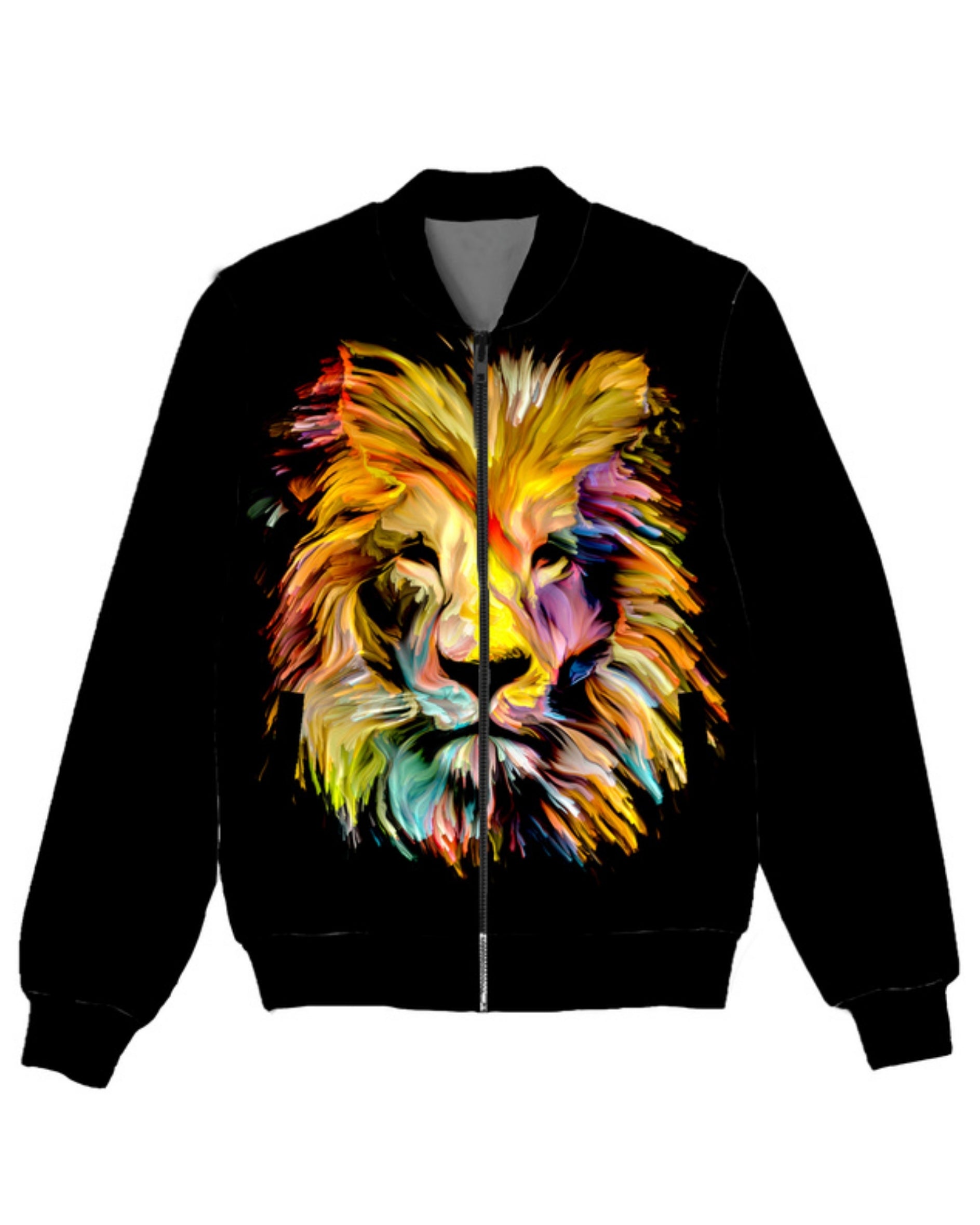 The Obsidian Monarch Bomber features a striking lion composition set against a deep black base, allowing the layered spectrum of gold, crimson, cobalt, and emerald to emerge with precision and depth.