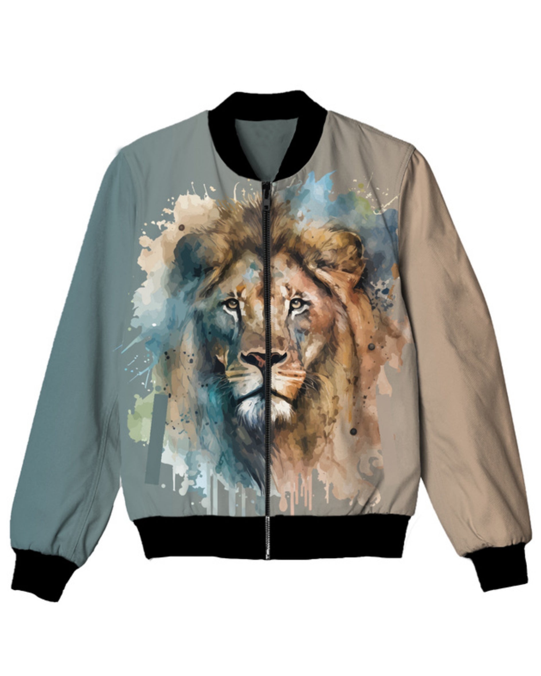 The Sovereign Earth Bomber presents a refined lion composition rendered in muted earth tones — sand, stone, sage, and washed blue. The watercolor treatment softens the intensity, allowing authority to emerge through balance rather than force.